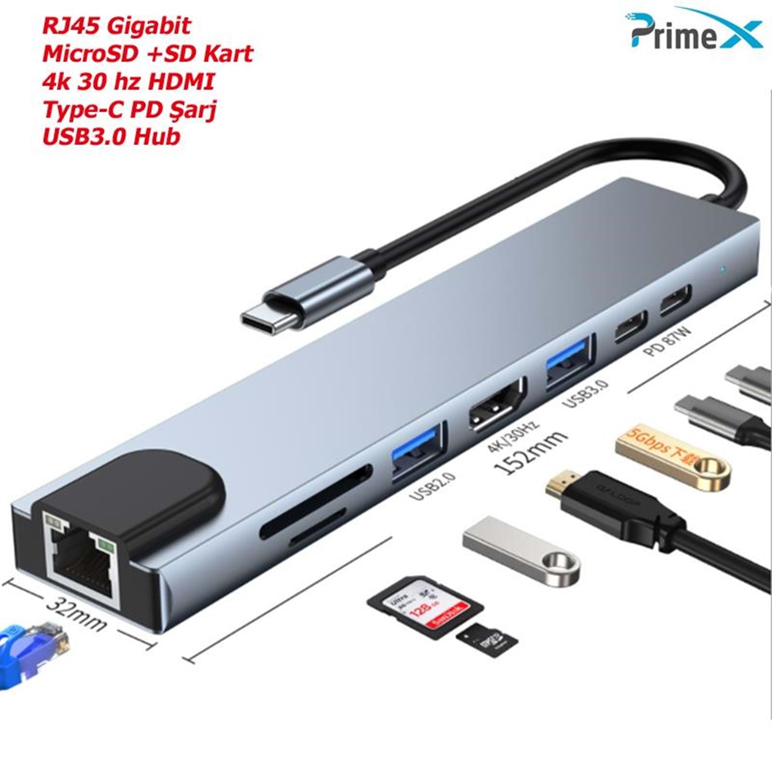 PrimeX PX-U520 4K@30Hz Gri Metal Type-C to 4K HDMI+USB 3.0+RJ45+SD Kart+PD şarj Çevirici Adaptör