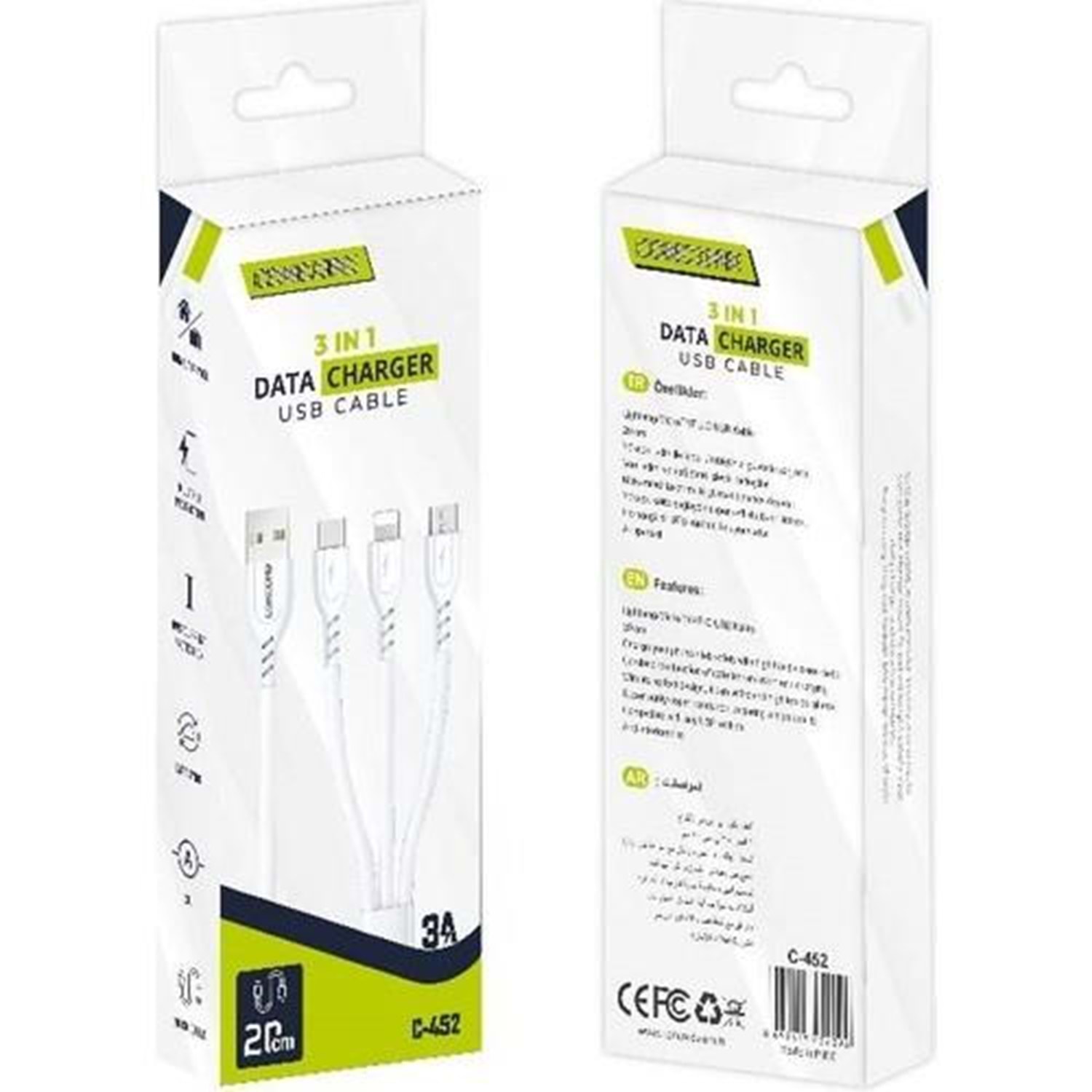 Concord C-452 3 IN 1 Telefon Şarj Kablosu 20cm 5V 3A (Lightning, Type C, Micro USB)